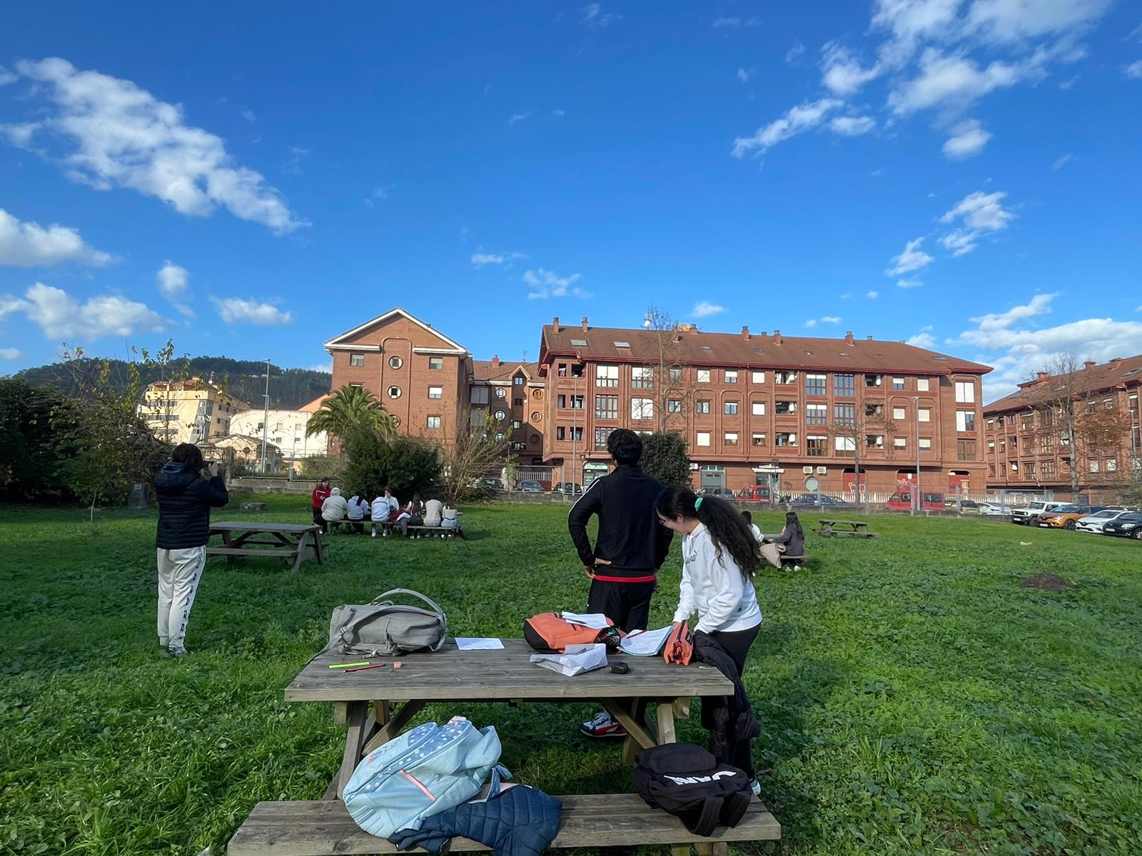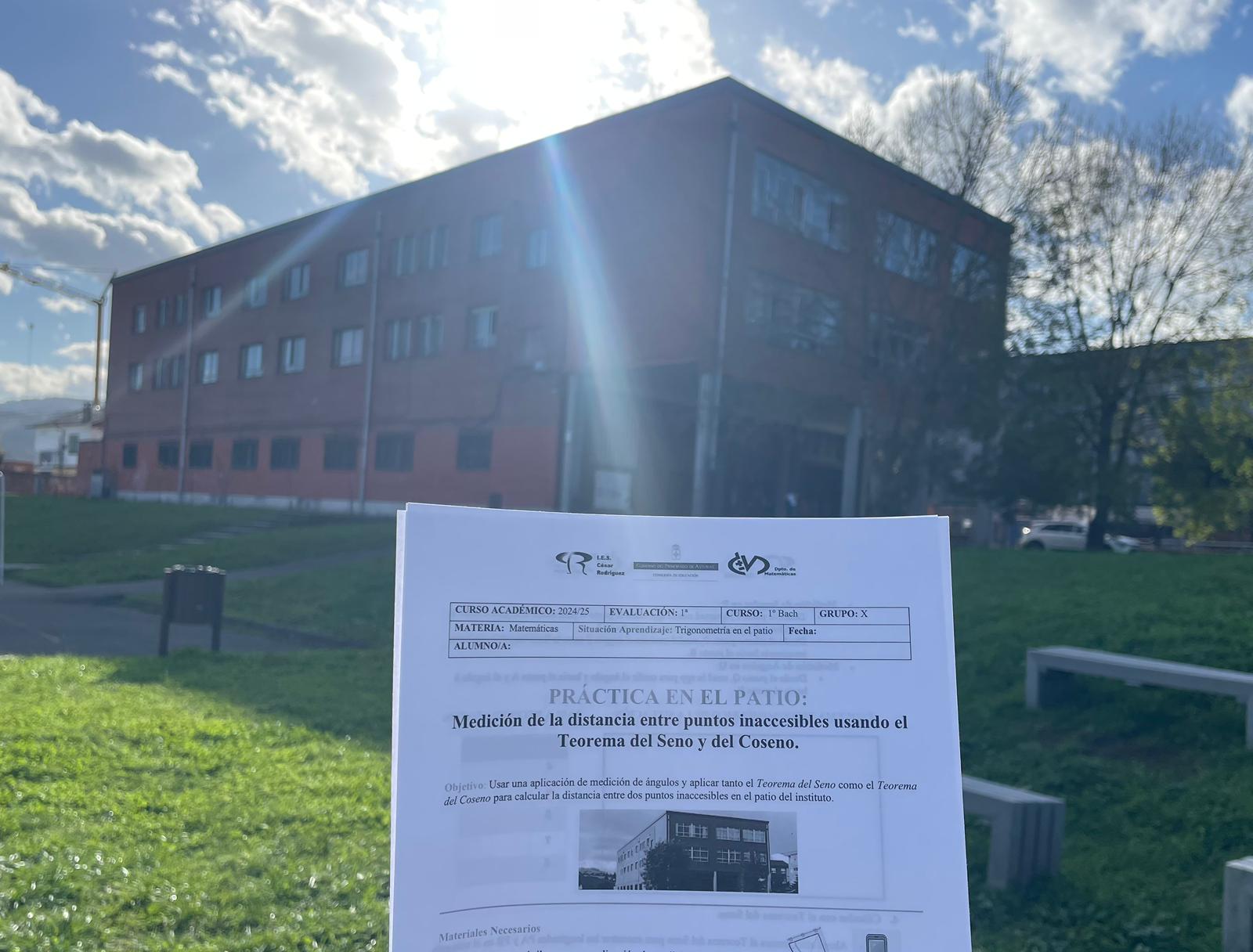 El pasado viernes, 29 de noviembre, el alumnado de 1º X salió al patio para realizar una práctica matemática. Así, calcularon la medida de una distancia inaccesible con teoremas trigonométricos. ¡Algunos intentaron calcular las dimensiones de edificios de fuera del instituto!