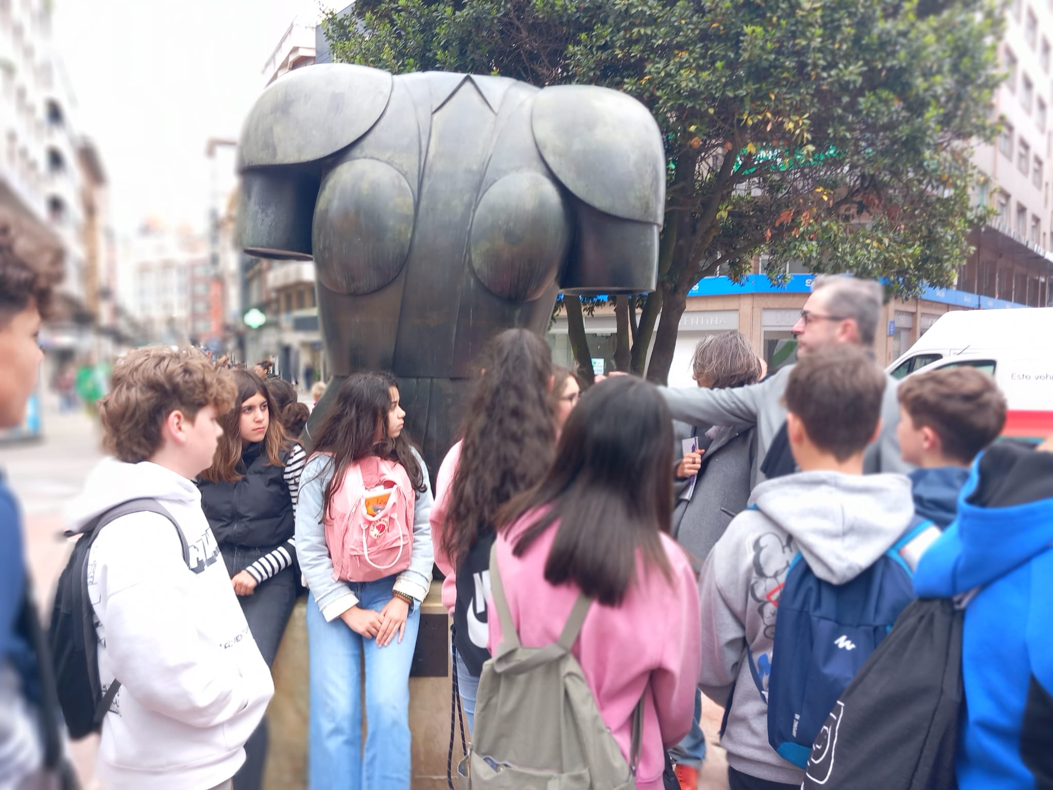 Seguimos hasta la plaza de la Catedral y saludamos a La Regenta, fuimos a ver al viajero de Úrculo y a la Muyerina (mujer sentada) de delante de la Universidad hasta llegar a La Escandalera, con Los Asturcones y La Muyerona (Maternidad) de Botero.