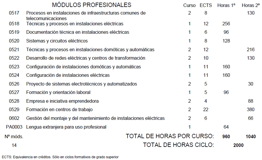 La formación establecida en el conjunto de módulos profesionales del Título garantiza el nivel de conocimiento exigido en el carné de Instalador Autorizado en baja tensión, tanto en la Categoría básica como en la de especialista.