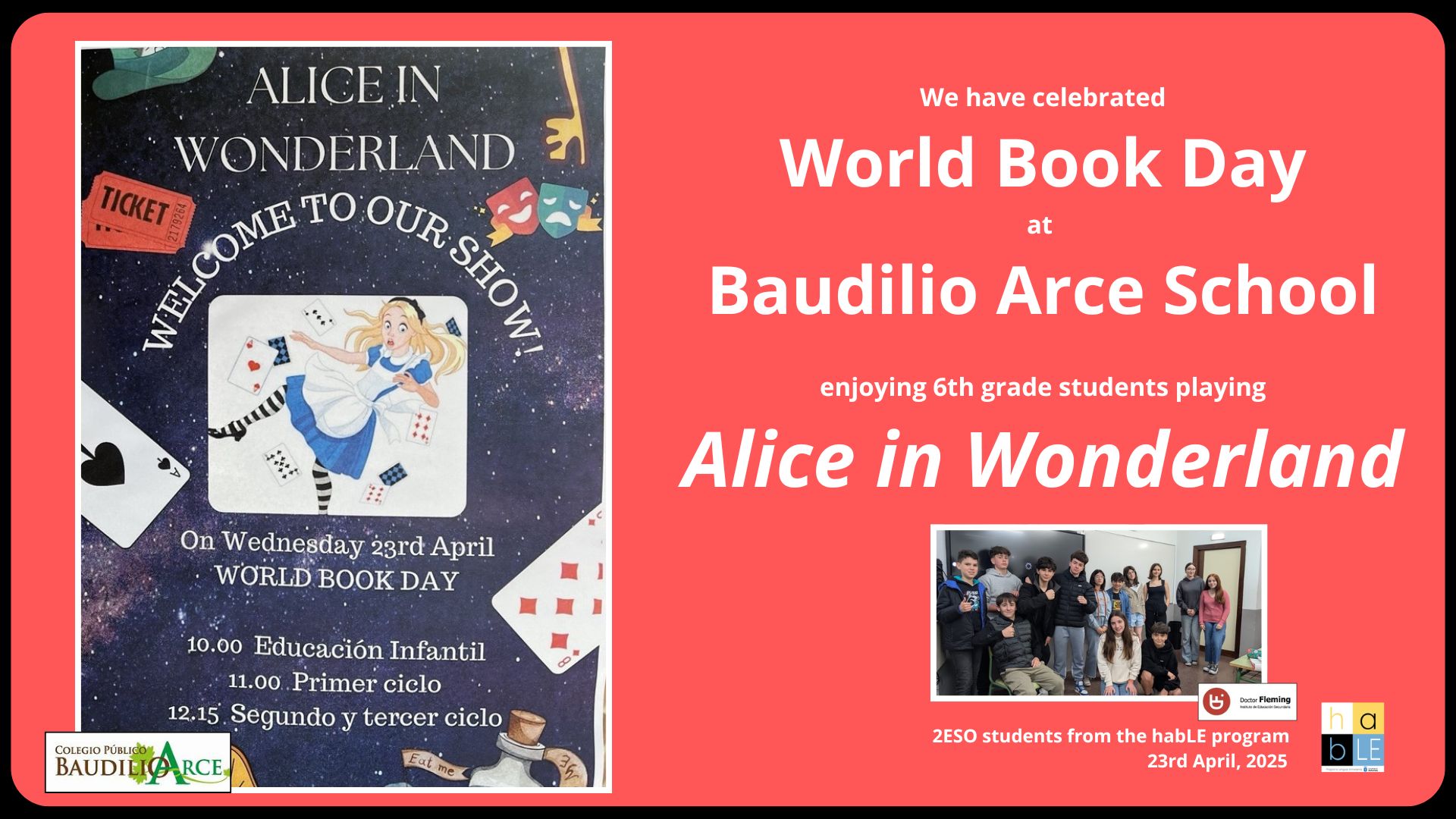 El alumnado de 2ºESO del programa habLE ha tenido el honor de ser invitado por el colegio Baudilio Arce al estreno de la obra Alice in Wonderland, representada en inglés por el alumnado de 6º de primaria. ¡Qué maravillosamente bien lo han hecho! ¡Cuánto talento! ¡Qué manera más bonita del celebrar el Día del Libro con ellos! ¡Gracias!