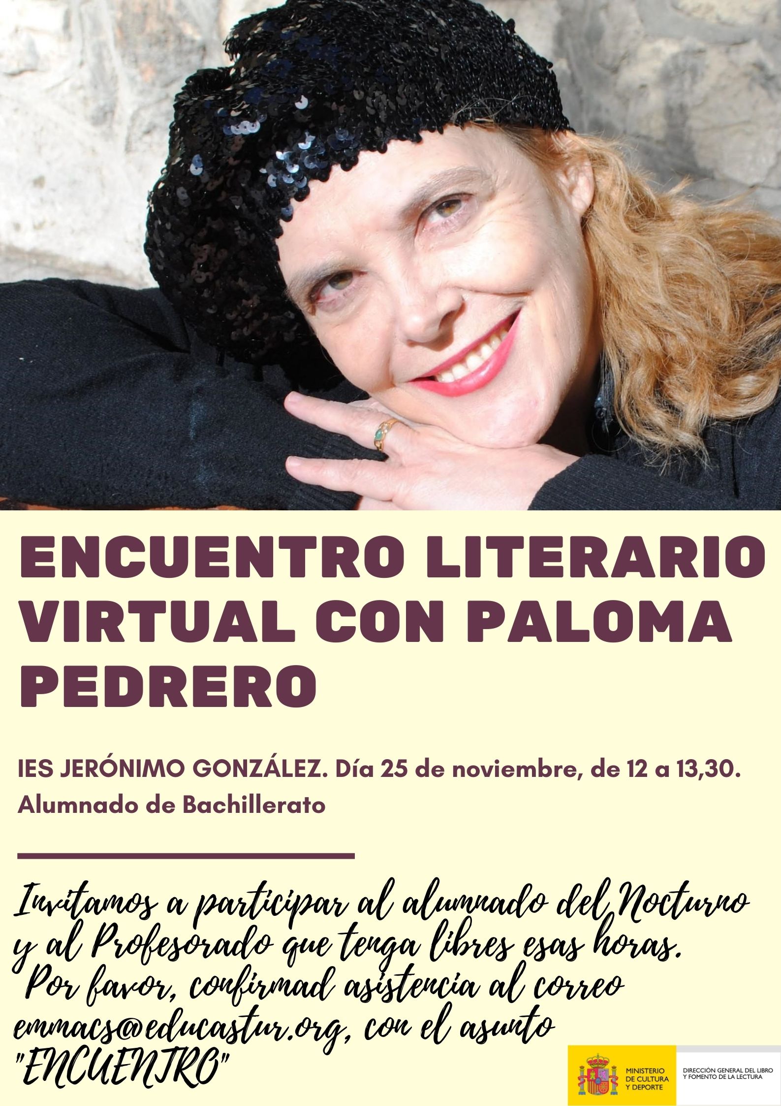 El pasado 25 de noviembre realizamos un Encuentro virtual con la dramaturga y actriz Paloma Pedrero, a través de la plataforma TEAMS. La conexión se realizó con el alumnado de Bachillerato (tanto desde clase como desde casa, en algunos casos de confinamiento) y con el profesorado que pudo sumarse al acto.Fue todo un éxito para el Centro y un lujo. Los alumnos y alumnas nos escriben mensajes con lo muchísimo que les gustó y lo interesante que les resultó la charla.