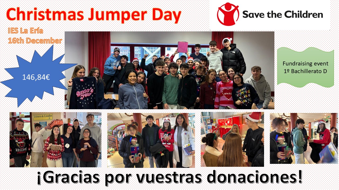 El alumnado de 1º Bachillerato D está trabajando en una campaña para apoyar la tradicional iniciativa británica "Chirstmas Jumper Day" en la materia de inglés. Tendrá lugar en el IES La Ería el día 16 de diciembre. Se trata de una recogida de fondos para la organización Save the Children a la vez que se llevan puestos jerseys con decoración navideña. No hace falta comprar uno, se puede diseñar, intercambiar o comprar de segunda mano. Por grupos, el alumnado ha diseñado carteles, ha informado a todas las clases del centro con una breve presentación en inglés, ha grabado dos videos publicitarios y tres anuncios en Radio PerifERÍA. De momento, os mostramos algunas fotos de los trabajos y los anuncios de radio. ¡Esperemos recoger muchas donaciones y ver muchos de vuestros jerséis el día 16 de diciembre! "