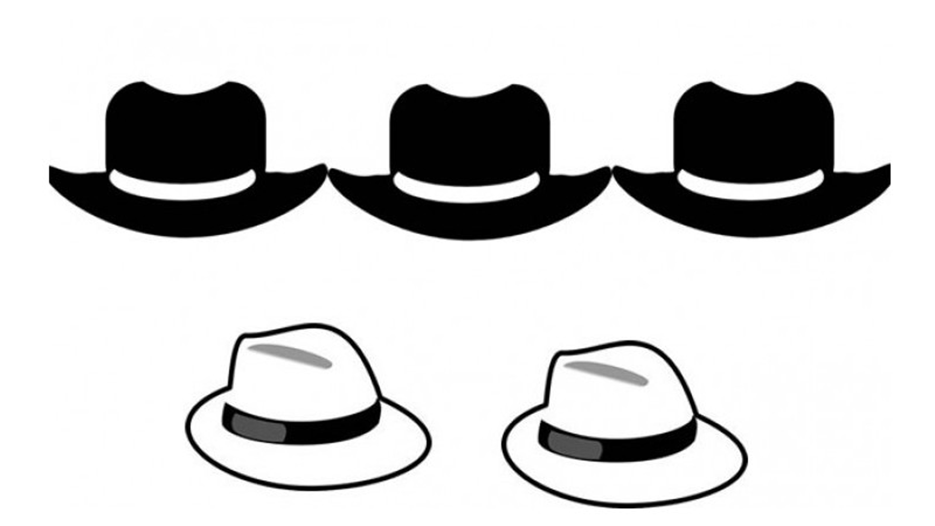 Tres hombres se enfrentan al siguiente reto. En una mesa hay tres sombreros blancos y dos negros. Los tres hombres se ponen un sombrero al azar cada uno y sin mirar el color.