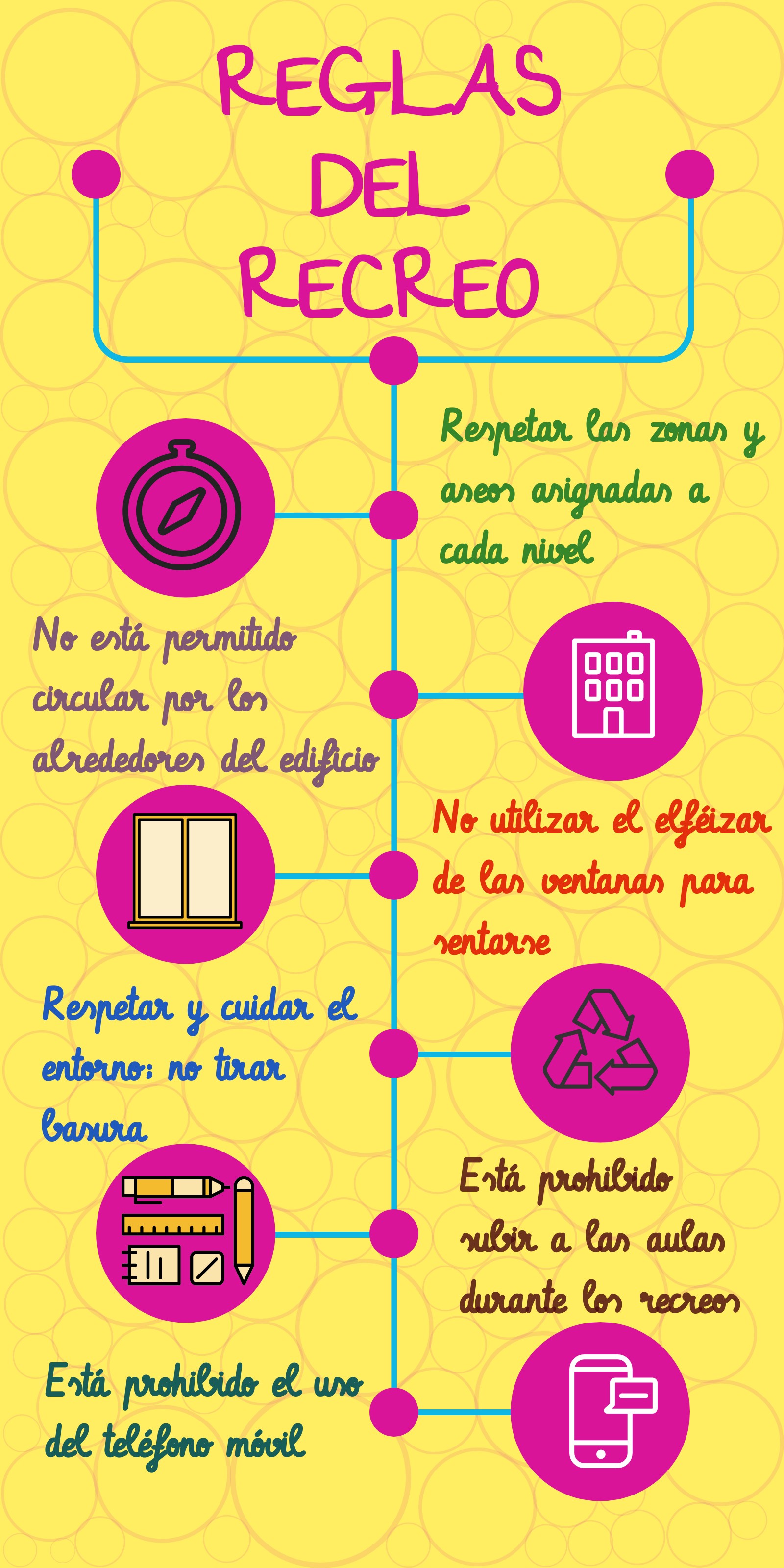 Por eso, nuestras docentes encargadas de velar por el orden en el patio han elaborado una primeras reglas básicas que debemos cumplir para disfrutar durante ese periodo de relax, descanso, diversión...