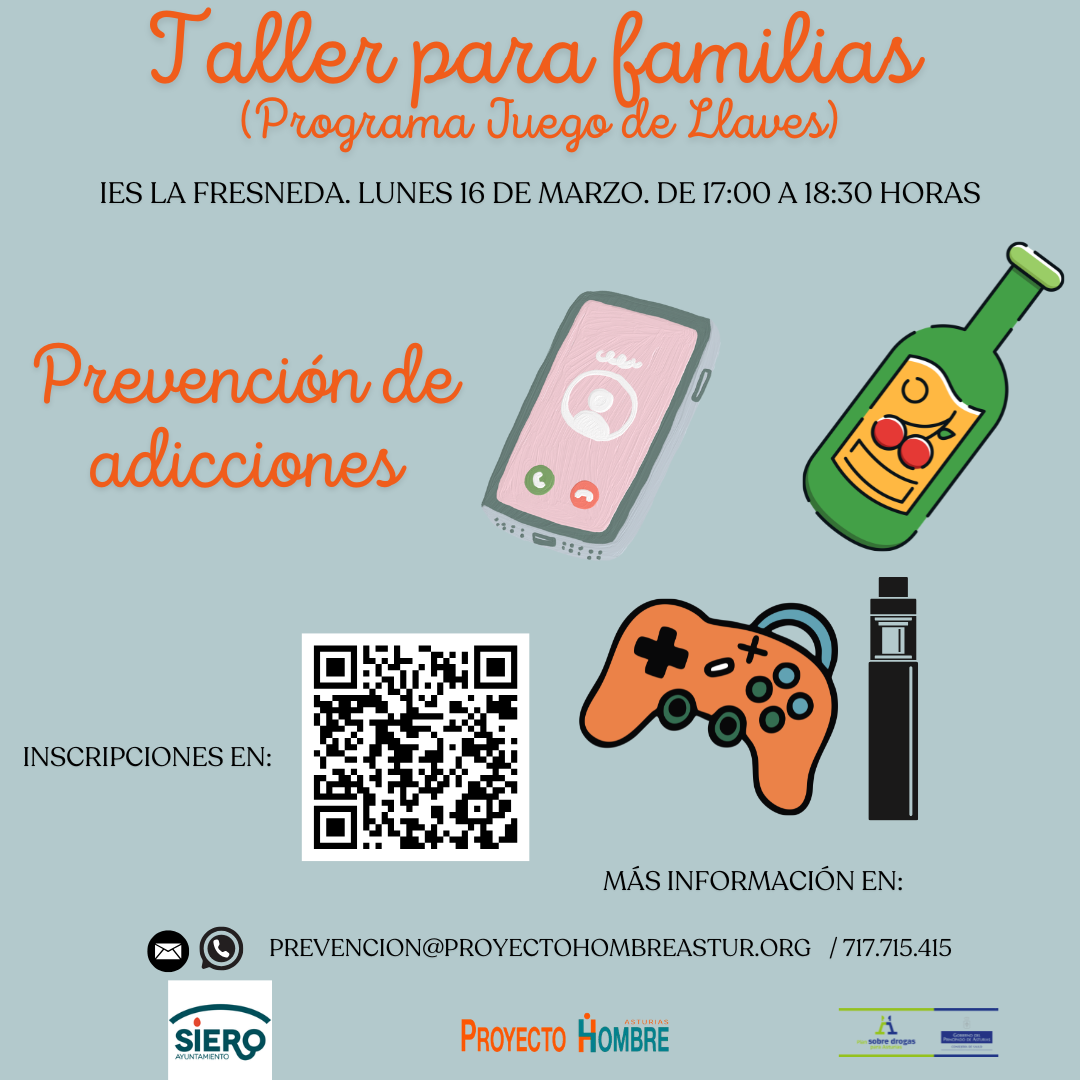 Desde el IES La Fresneda y en colaboración con el AMPA del centro, se organiza un Taller de Familias para el próximo lunes, 16 de marzo, sobre "Prevención de adicciones". El tema versará sobre la prevención de adicciones en adolescentes, incluido el uso de pantallas. Se solicita que las personas interesadas se inscriban a través del código QR del cartel, o bien comunicándolo a cualquier persona integrante del AMPA, para tener una aproximación del número de participantes.
