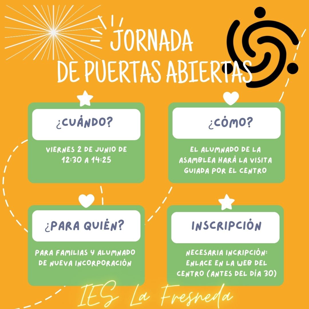 El próximo viernes 2 de junio, en horario de 12:30 a 14:25, celebraremos la jornada de puertas abiertas del centro para las familias del alumnado de nueva incorporación.