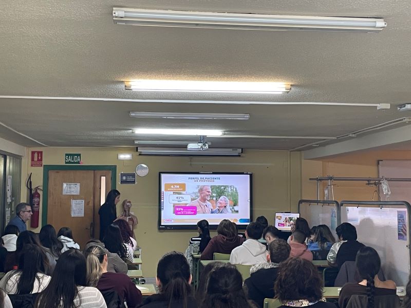 Siguiendo la línea de empleabilidad de acercar la empresa al alumnado se ha realizado una charla, impartida por Marta García Valle, delegada comercial (Expert Sales Detailing) del laboratorio Haleon Spain S.A, donde se han presentado a los diferentes grupos asistentes (CAE diurno y vespertino y Farmacia) los productos comercializados por su laboratorio relacionados con el cuidado de la boca: dentífricos para la hipersensibilidad dentinaria y para los problemas periodontales (Sensodyne y Parotontax, incluyendo su descripción, modo de acción y presentaciones), colutorios para completar la higiene...Además trata del cuidado de las prótesis dentales: higiene y fijación en la boca (pastillas de limpieza y adhesivos Corega), destacando la importancia que este tema puede tener principalmente para los pacientes ancianos o los usuarios de centros residenciales.
