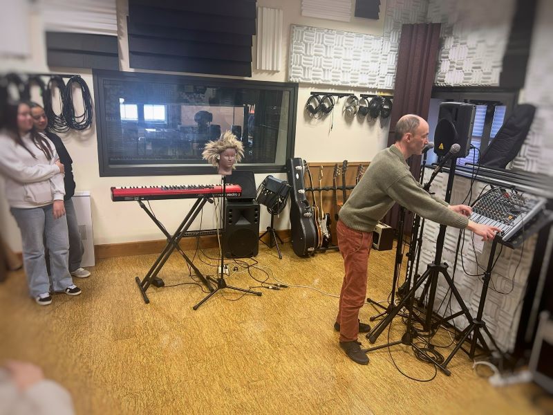 El alumnado de la materia optativa Laboratorio de Sonido en 4° de ESO asistió acompañado de las profesoras de Música el 21 y el 27 de enero a la visita al estudio de grabación del Taller de Músicos en el Antiguo Instituto de Gijón. Fuimos recibidos y orientados por Fernando, que nos ilustró sobre todas las actividades que puede hacer un técnico de sonido. Muy interesante, seguro que se despertó alguna vocación.