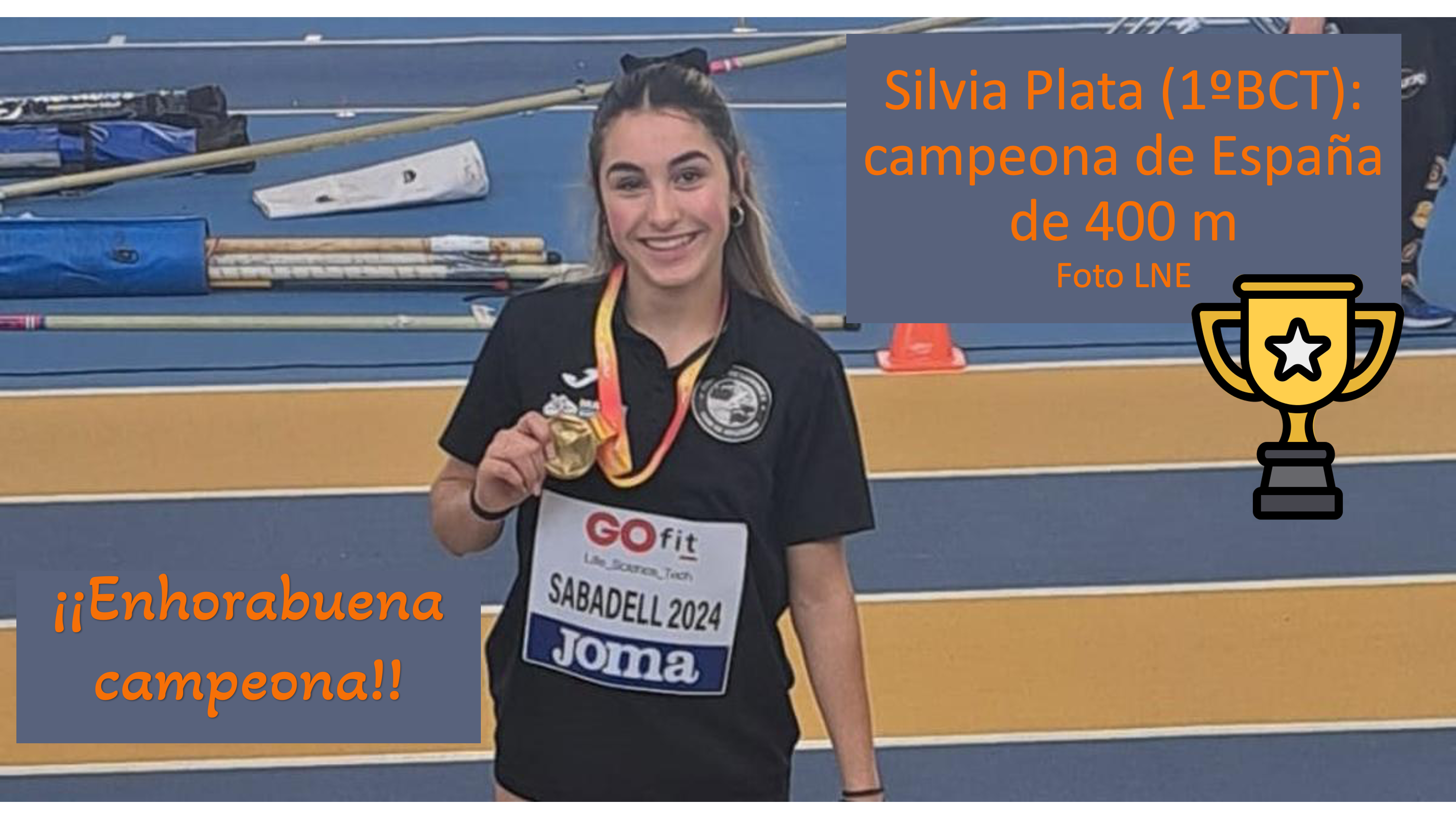 ¡¡Enhorabuena campeona!! Nuestra alumna Silvia Plata (1ºBCT) se ha proclamado este fin de semana como campeona de España en la prueba de 400m lisos.