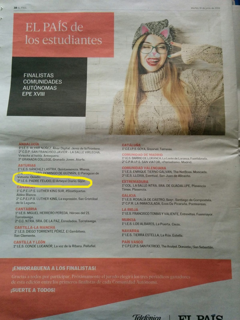 "El Arbeyal Diario", periódico elaborado por el alumnado de la asignatura Periódico Digital, se ha clasificado como tercer finalista de Asturias en el concurso "El País de los Estudiantes". Enhorabuena a los y las participantes por el buen trabajo desarrollado.