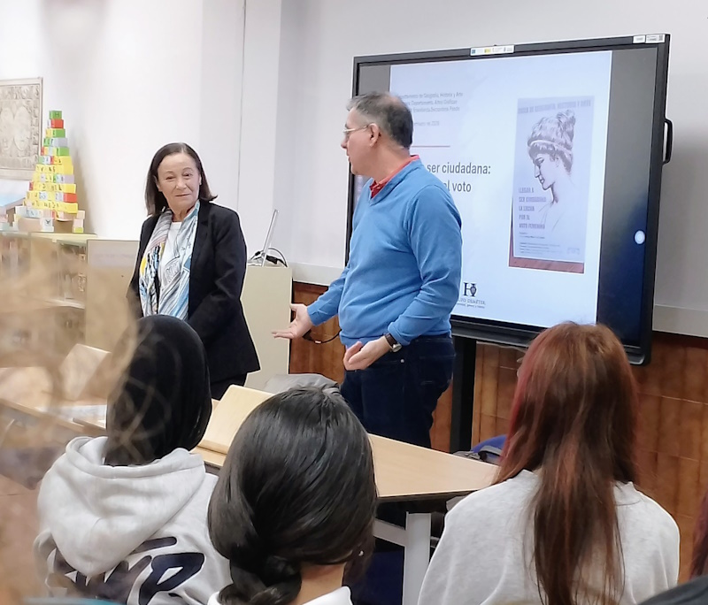 El acto fue presentado por el profesor Carlos Benjamín Pereira, quien introdujo la temática y destacó su importancia para la formación humanística del alumnado. La ponencia, titulada “Llegar a ser ciudadana. La lucha por el voto femenino”, fue impartida por la catedrática de Historia Antigua de la Universidad de Oviedo, María Cid López, con la asistencia de los grupos de 2.º de Bachillerato de Historia del Arte y 4.º de ESO B y D.