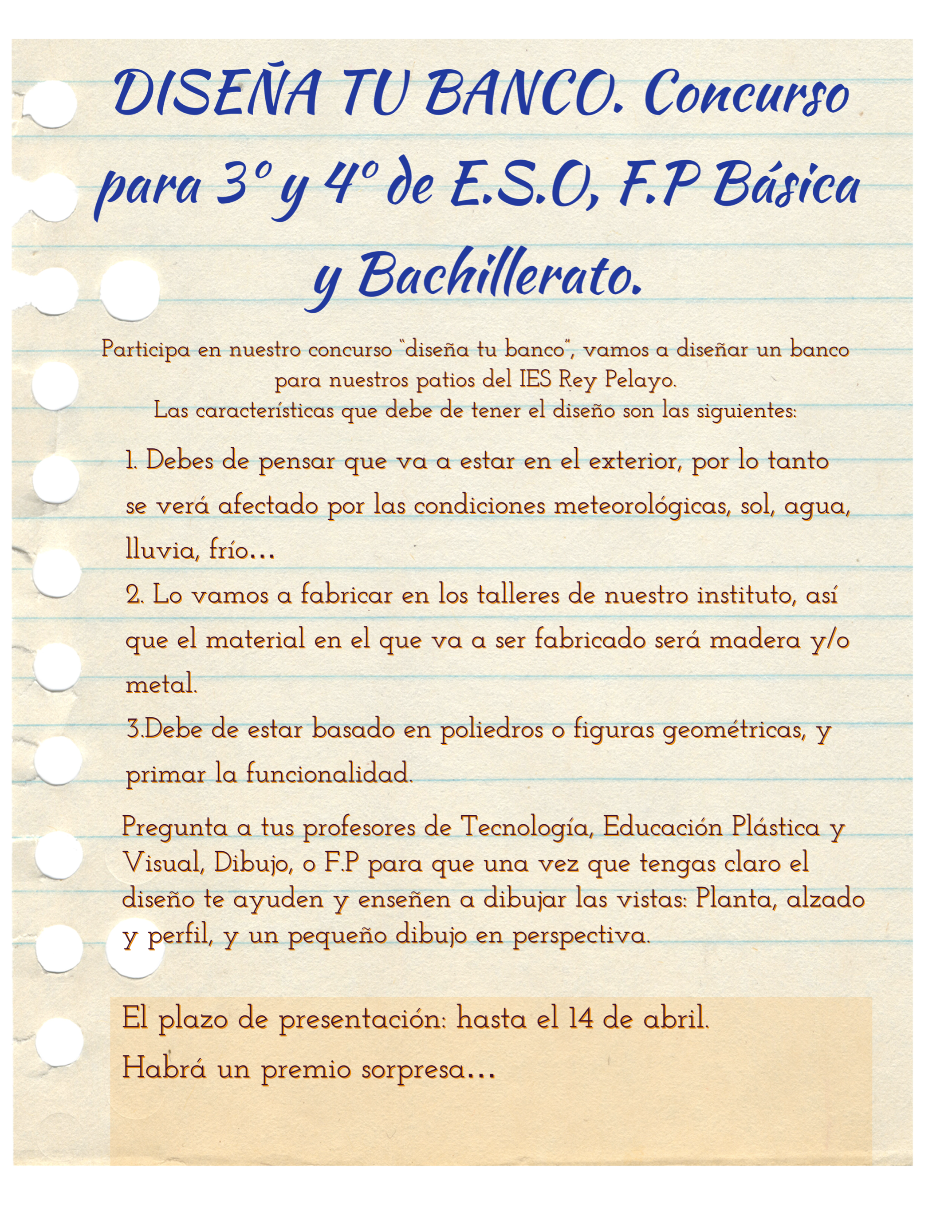Desde el grupo Crea Tu Habitat, hemos propuesto a todos los estudiantes que conviven en el IES Rey Pelayo que diseñen los espacios donde estar a gusto. En este proyecto, hemos propuesto al alumnado que diseñe su propio banco.