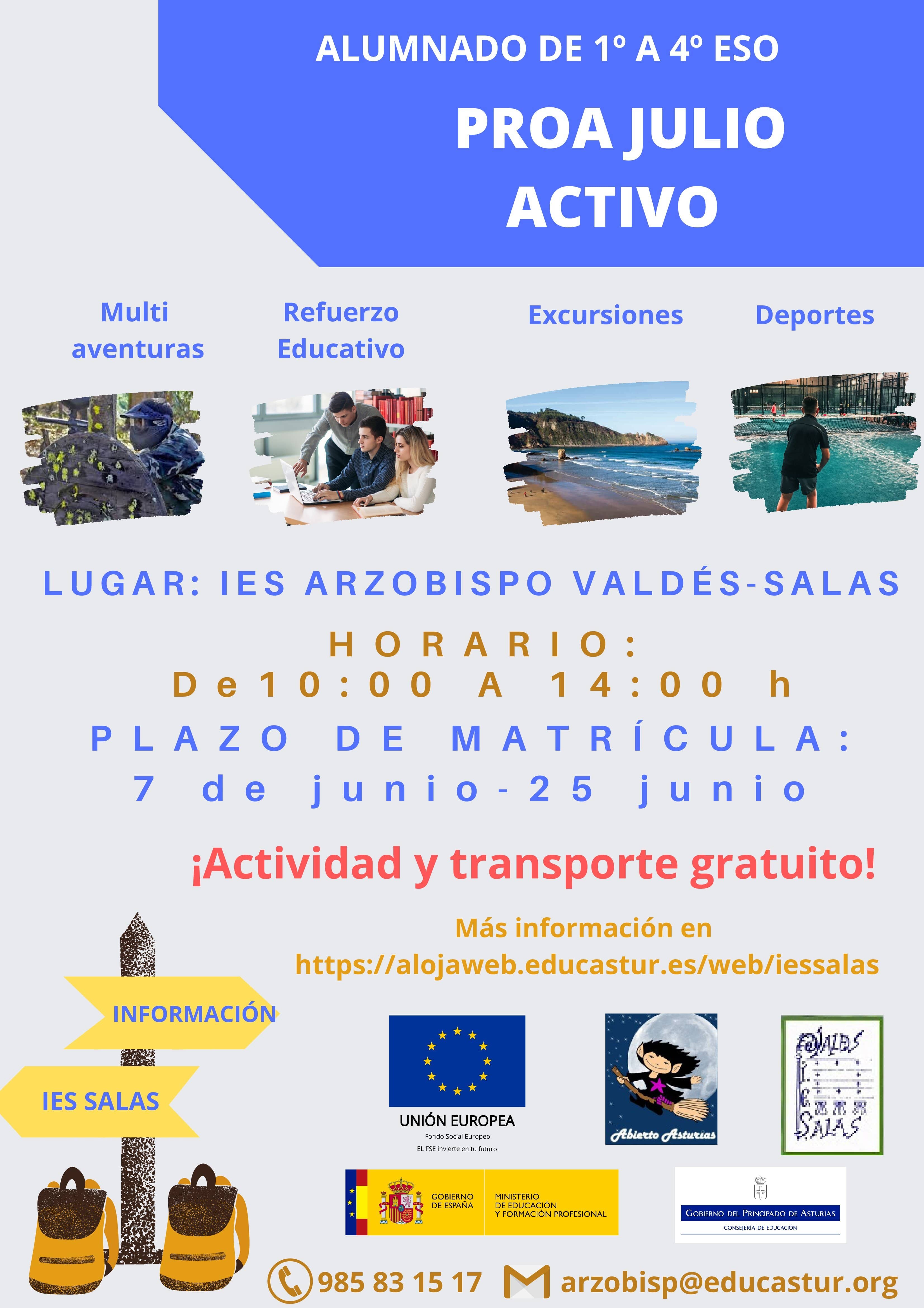 Este curso, el IES Arzobispo Valdés-Salas ofrece unas actividades durante tres semanas del mes de julio para el alumnado del centro, dentro del Plan PROA +. El número de plazas es limitado y es necesaria una preinscripción.