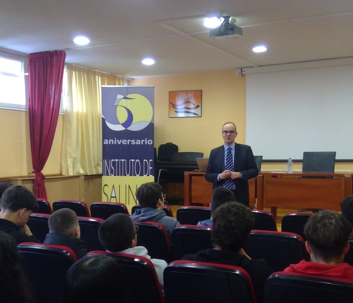 El embajador Martínez Serrano, quien cursó cuatro años en el IES de Salinas antes de embarcarse en su vida universitaria, ofreció una charla enriquecedora y motivadora al alumnado de bachillerato. Durante su intervención, transmitió el valor del trabajo, la vocación y el servicio a los demás, destacando la importancia de la dedicación y el esfuerzo en cualquier ámbito profesional.