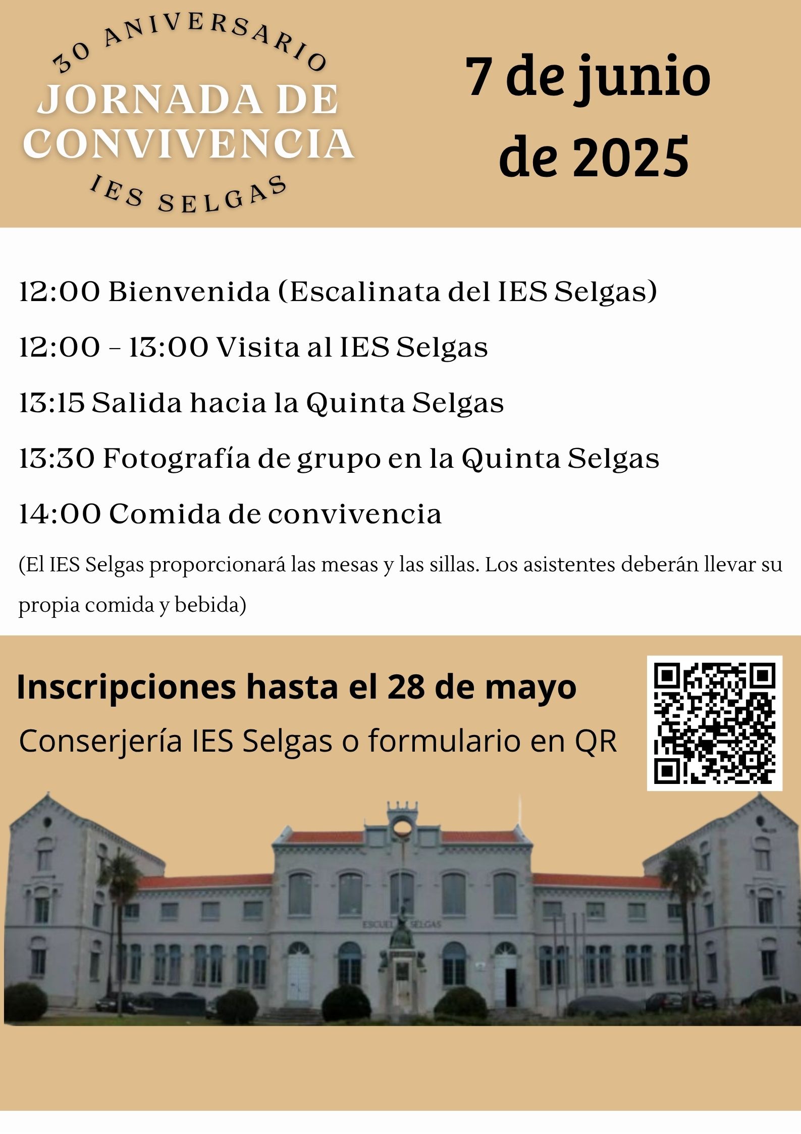 NOTA IMPORTANTE: Aunque no vayas a participar en todas las actividades, la inscripción es obligatoria. En el caso de no participar en la comida, el número de comensales que debes indicar en el formulario es 0. Puedes traer a algún acompañante que no haya estado directamente vinculado con las Escuelas o con el IES actual. Eso si, no te olvides de incluirlo en el apartado de comensales.