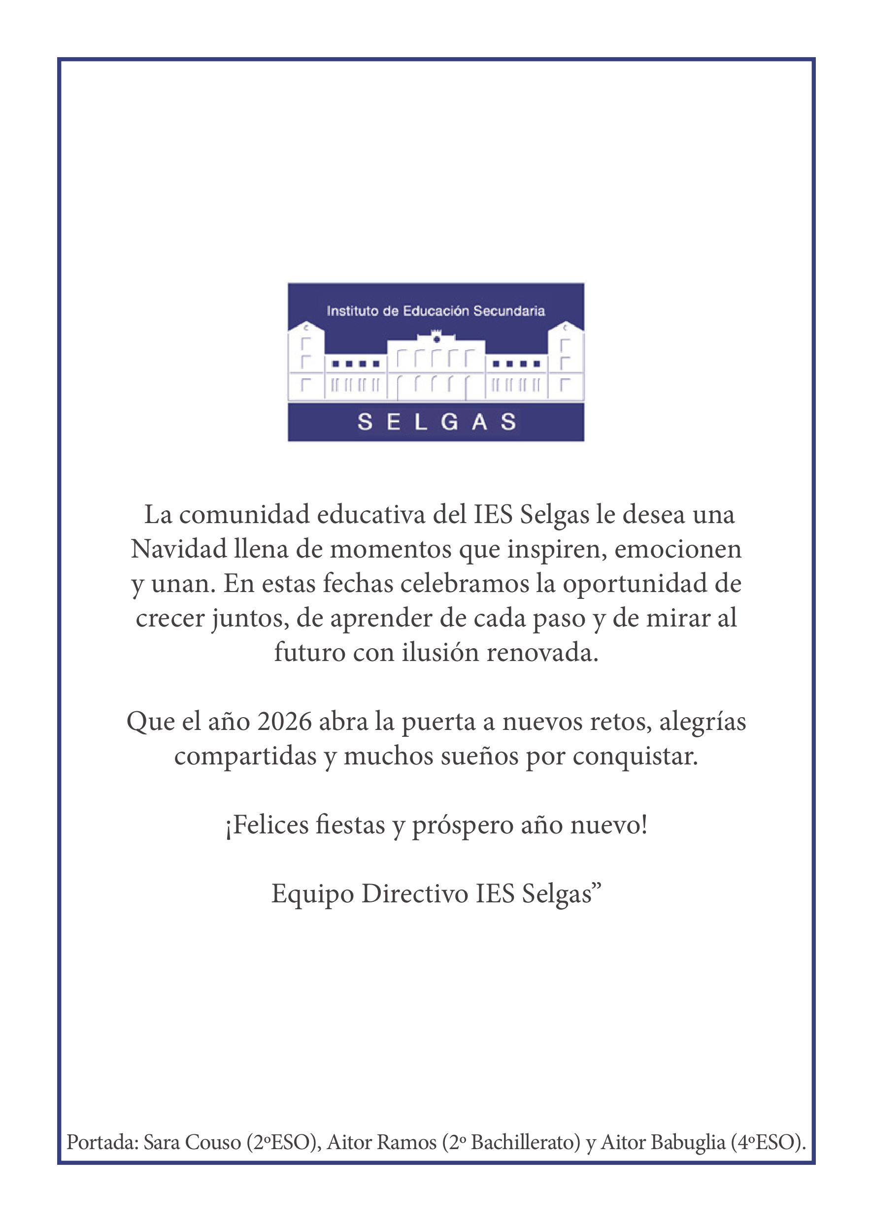 Con la postal navideña de este año el Equipo Directivo del IES Selgas desea una feliz navidad a todo la comunidad educativa de nuestro centro. El diseño de este año muestra a las cuatro propuestas ganadoras del concurso de postales del curso 2024-2025 en las diferentes categorías (inglés, francés, asturiano y lenguas clásicas).