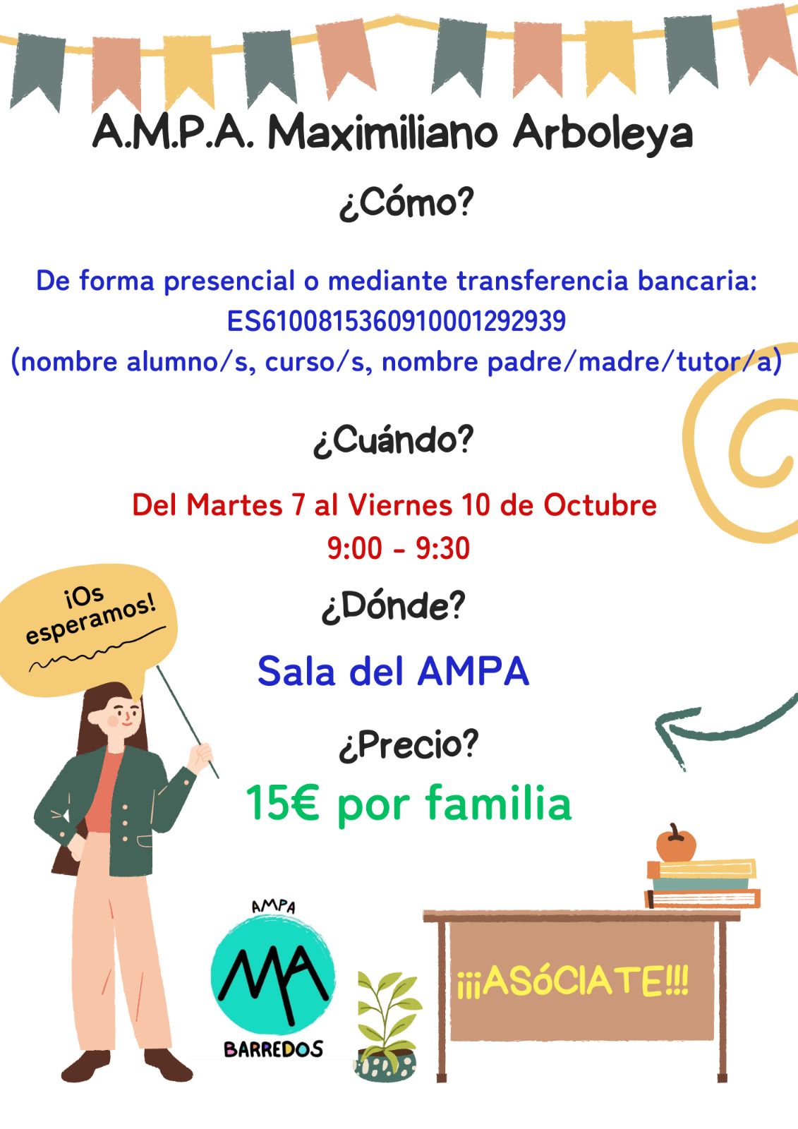 Formar parte de la AMPA es muy sencillo. Solo es necesario inscribirse abonando la cuota anual de 15€ de forma presencial o por transferencia bancaria. Asociarse permite participar en las decisiones, acceder a actividades organizadas por la asociación y apoyar iniciativas que benefician directamente al alumnado y sus familias.