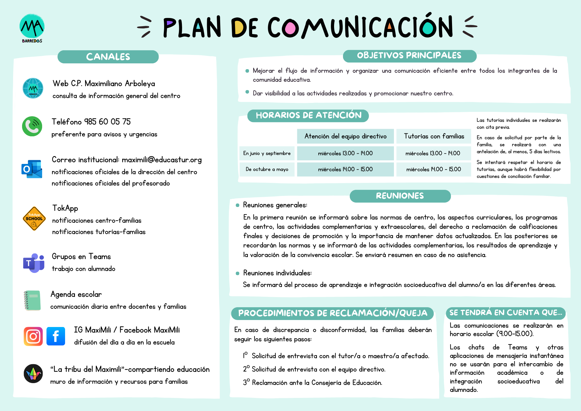 En esta infografía se muestran los principales elementos del Plan de Comunicación del centro: sus objetivos, los canales de comunicación y de difusión de información, los horarios de atención de equipo directivo y tutorías, los contenidos tratados en las reuniones generales e individuales con familias, los procedimientos de reclamación/queja y otros aspectos a tener en cuenta.