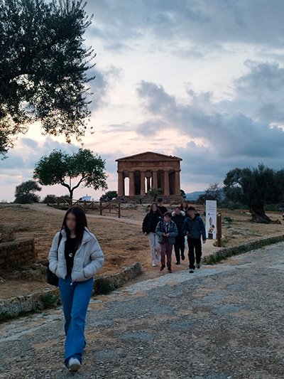 El jueves por la mañana las familias de acogida, junto al coordinador del proyecto italiano Giuseppe Micciche y la profesora colaboradora María Luisa Pendolino, nos llevaron en coche a la ciudad de Agrigento (capital italiana de la Cultura 2025), a unos 10 minutos de Aragona. Allí se encuentra el parque arqueológico del Valle de los Templos, uno de los monumentos Patrimonio Universal de la Humanidad más importantes de toda Italia. Comenzamos nuestro itinerario por el Jardín de Kolymbetra con un guía que nos explicó los orígenes milenarios y las diferentes etapas históricas de este lugar lleno de naranjos, limoneros, y olivos centenarios. La visita terminó con una “expedición” al interior de una pequeña cueva con murciélago incluido.