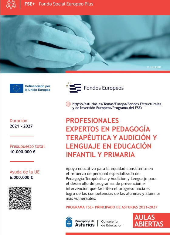 Es importante destacar la labor del Fondo Social Europeo Plus en este recurso de atención a la diversidad, al ser el responsable directo de la co-financiación en un 60% del personal docente de PT y AL del Aula Abierta.