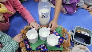 En enero estamos con lácteos, leche y yogur natural directamente de la ganadería a la escuela, mas natural y ecológica imposible.