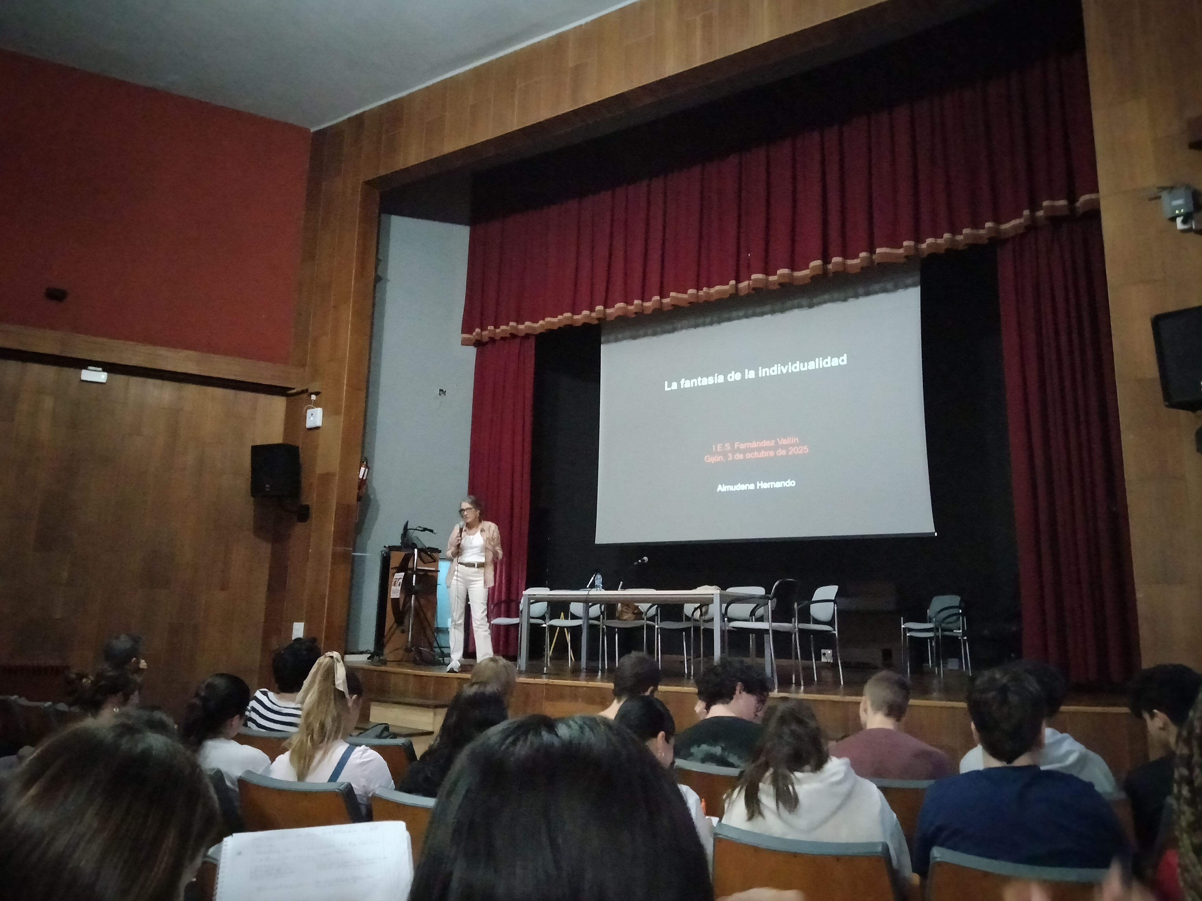 El pasado viernes visitó el IES Fernández Vallín la antropóloga Almudena Hernando Gonzalo, catedrática de Prehistoria de la Universidad Complutense de Madrid (UCM) y una de las investigadoras más citadas en su área de conocimiento. Invitada por el Departamento de Filosofía del centro, Hernando ofreció una charla a los estudiantes de 1.º de Bachillerato titulada "La fantasía de la individualidad", como su influyente libro de 2012. En ella repasó las diferencias entre la identidad relacional, propia de sociedades sin división del trabajo, y la identidad individual, que se va desarrollando y consolidando con la Modernidad. Relacionó estos dos tipos de identidad con los roles tradicionales de género y con el papel de los estereotipos de estatus a la hora de construir identidad individuales en posiciones de poder.