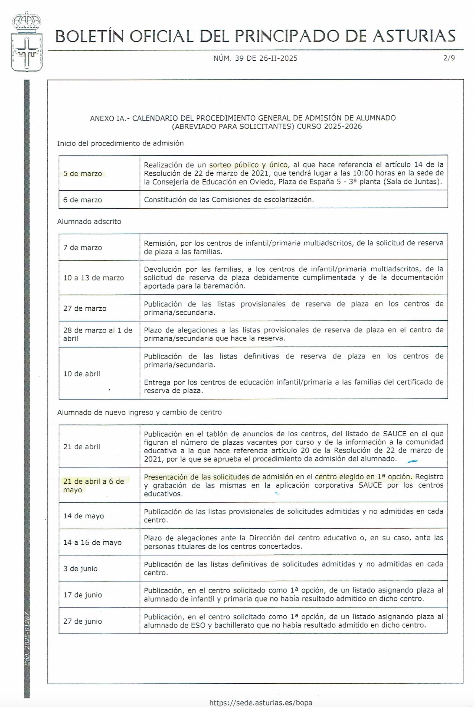 CALENDARIO DEL PROCEDIMIENTO DE ADMISIÓN DEL ALUMNADO
