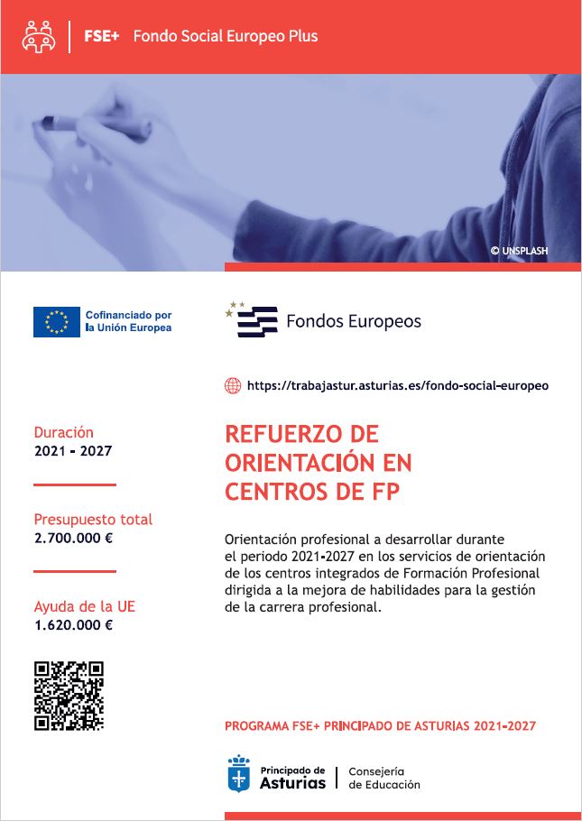 El programa de refuerzo de Orientadores y Orientadoras en Centros Integrados de Formación Profesional está cofinanciado por el Fondo Social Europeo Plus en un 60% en el marco del Programa FSE+ Principado de Asturias 2021-2027.