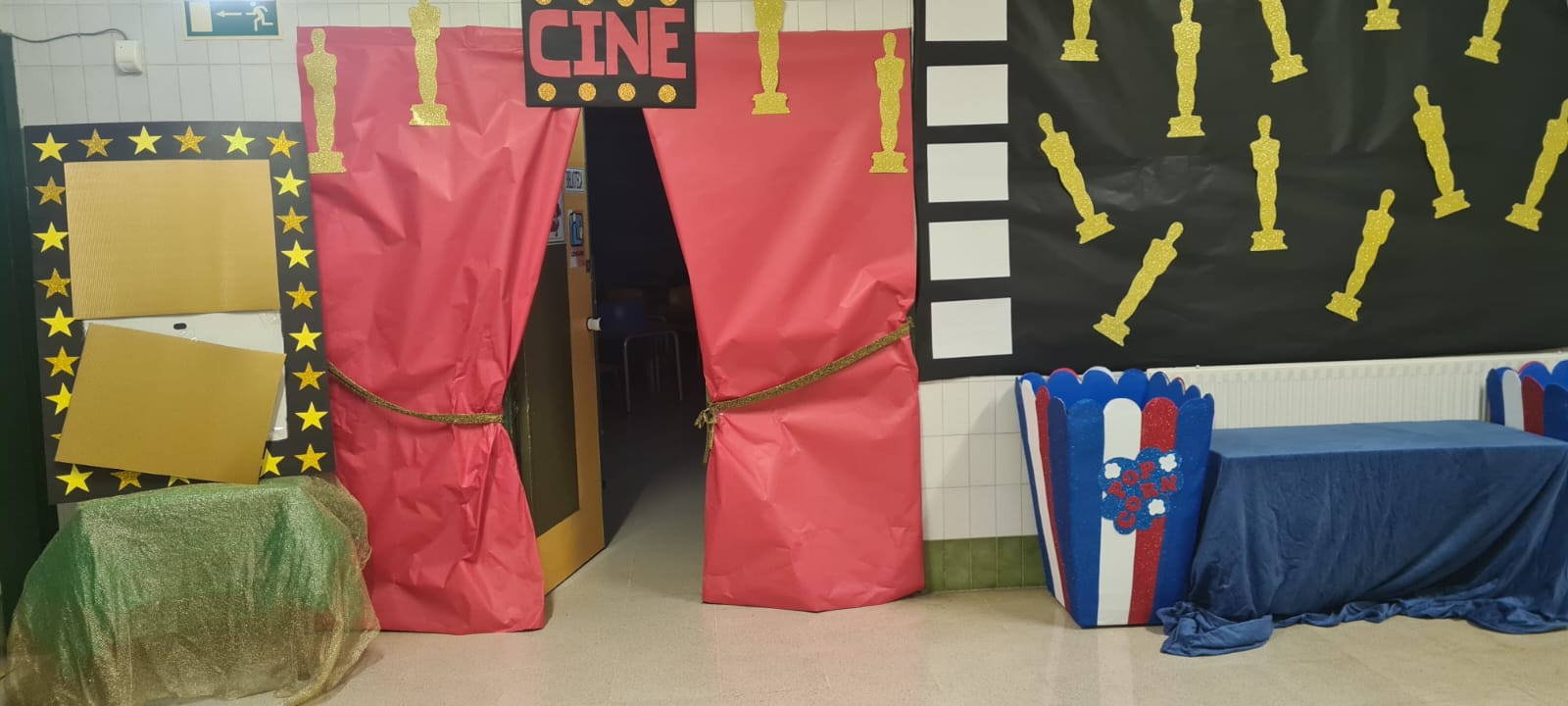 Pero nuestro carnaval no empieza ahí. Desde el día 6, comenzaremos a decorar nuestro colegio: pasillos, aulas... y hasta la biblioteca se convertirá en una sala de cine en la que las niñas y niños disfrutarán de sesiones de películas con tickets para la entrada y palomitas.