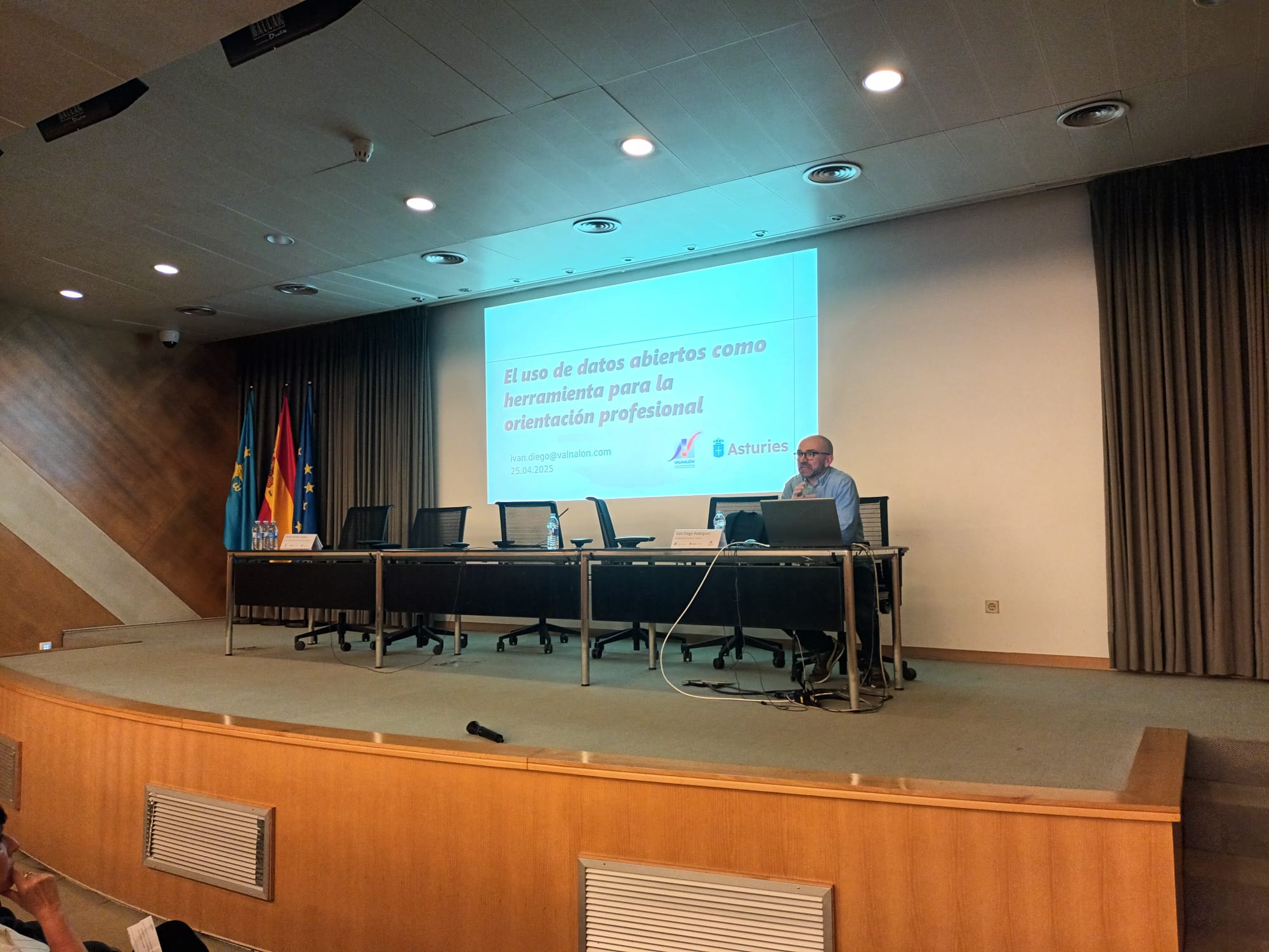 A continuación hubo un pequeño descanso y la tercera ponencia fue de D. Iván Diego Rodríguez, Coordinador de Proyectos en Valnalón, titulada “El uso de datos abiertos como herramienta para la orientación profesional: FP, pasarelas, inserción laboral y calidad de empleo”.