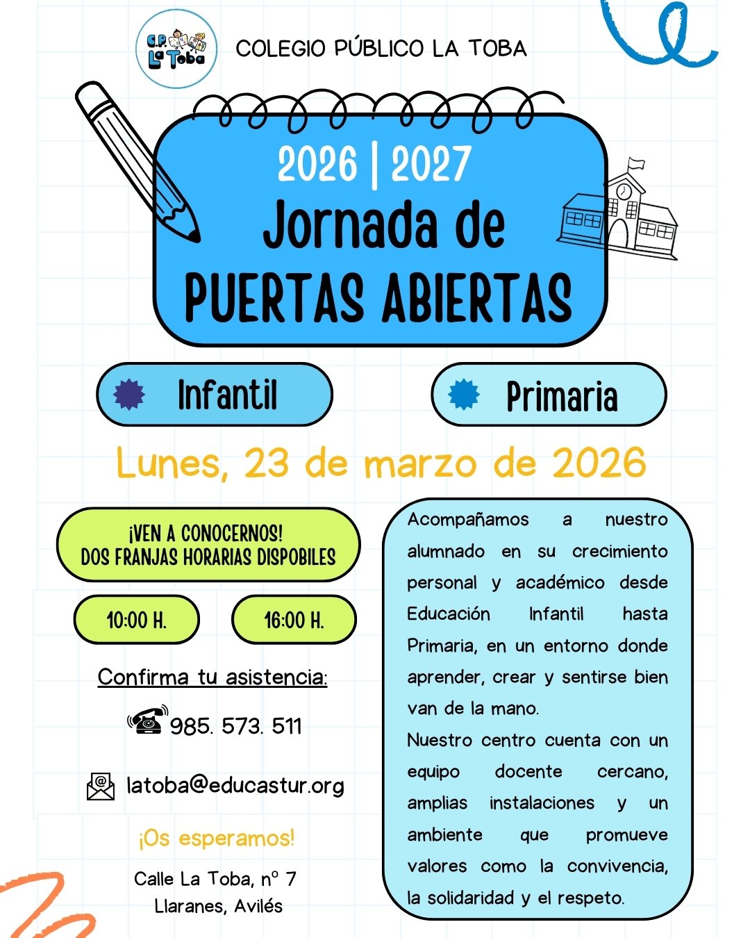El próximo lunes, 23 de marzo, tendrá lugar la jornada de puertas abiertas del cole. Haz click en el enlace para leer toda la información. ¡Os esperamos!