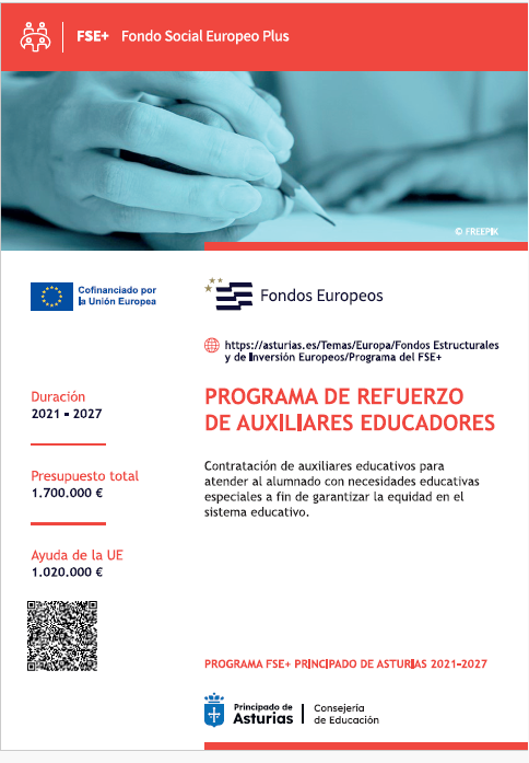 "El programa de refuerzo de auxiliares educadores está cofinanciado por el Fondo Social Europeo Plus en un 60% en el marco del Programa FSE* Principado de Asturias 2021-2027"