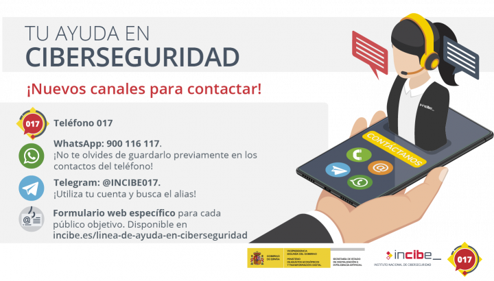 INCIBE, el instituto nacional de ciberseguridad, pone a disposición de los ciudadanos y empresas nuevos canales de chat de Whatsapp y Telegram para contactar con el 017,