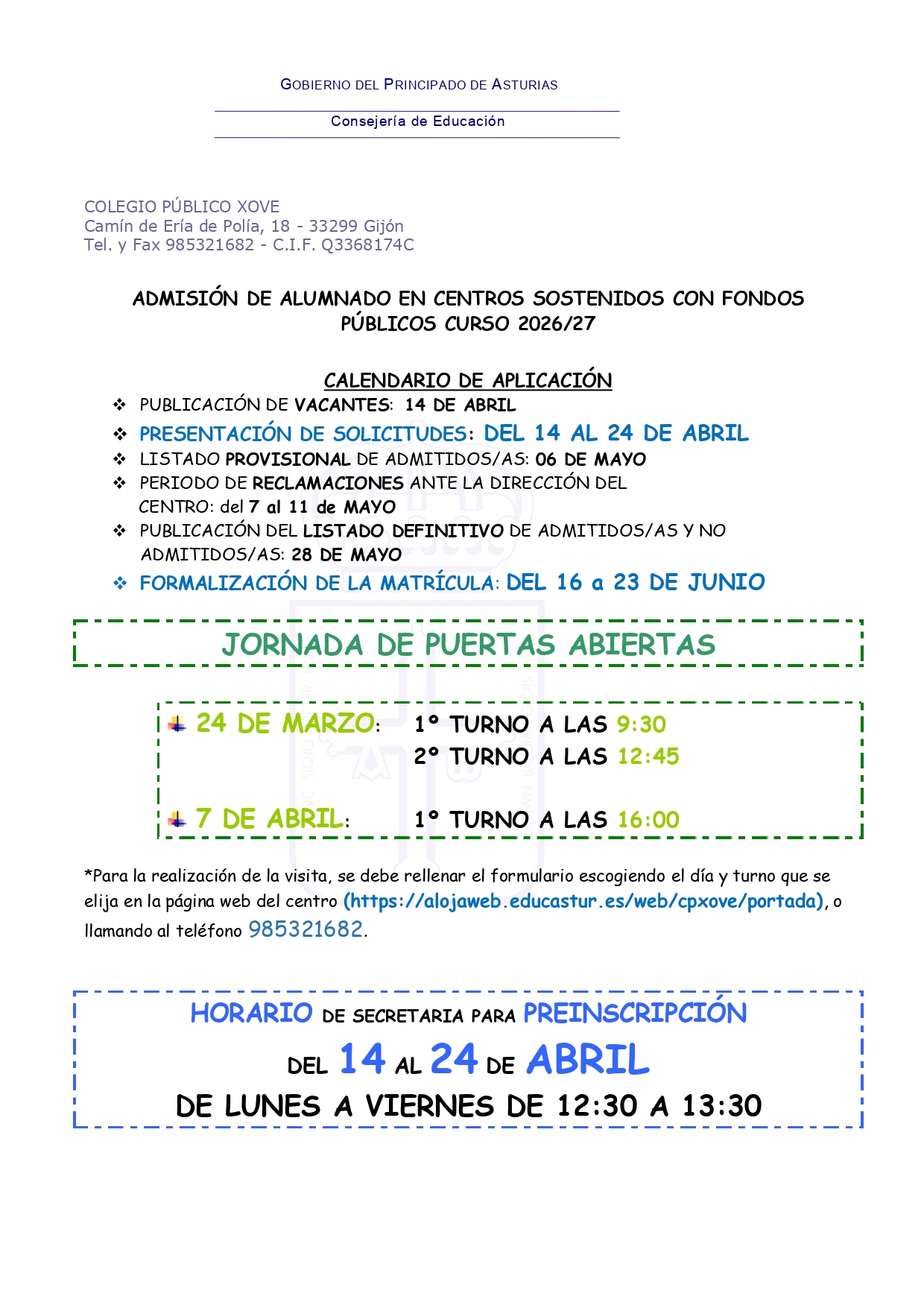 Os ofrecemos una guía completa con toda la información relativa al PROCEDIMIENTO DE ADMISIÓN DEL ALUMNADO PARA EL CURSO 2026-27, donde aparece el CALENDARIO DE ADMISIÓN Y MATRICULACIÓN y la información más destacada sobre nuestro centro como los DATOS DE CONTACTO, la OFERTA EDUCATIVA y los SERVICIOS con los que cuenta.