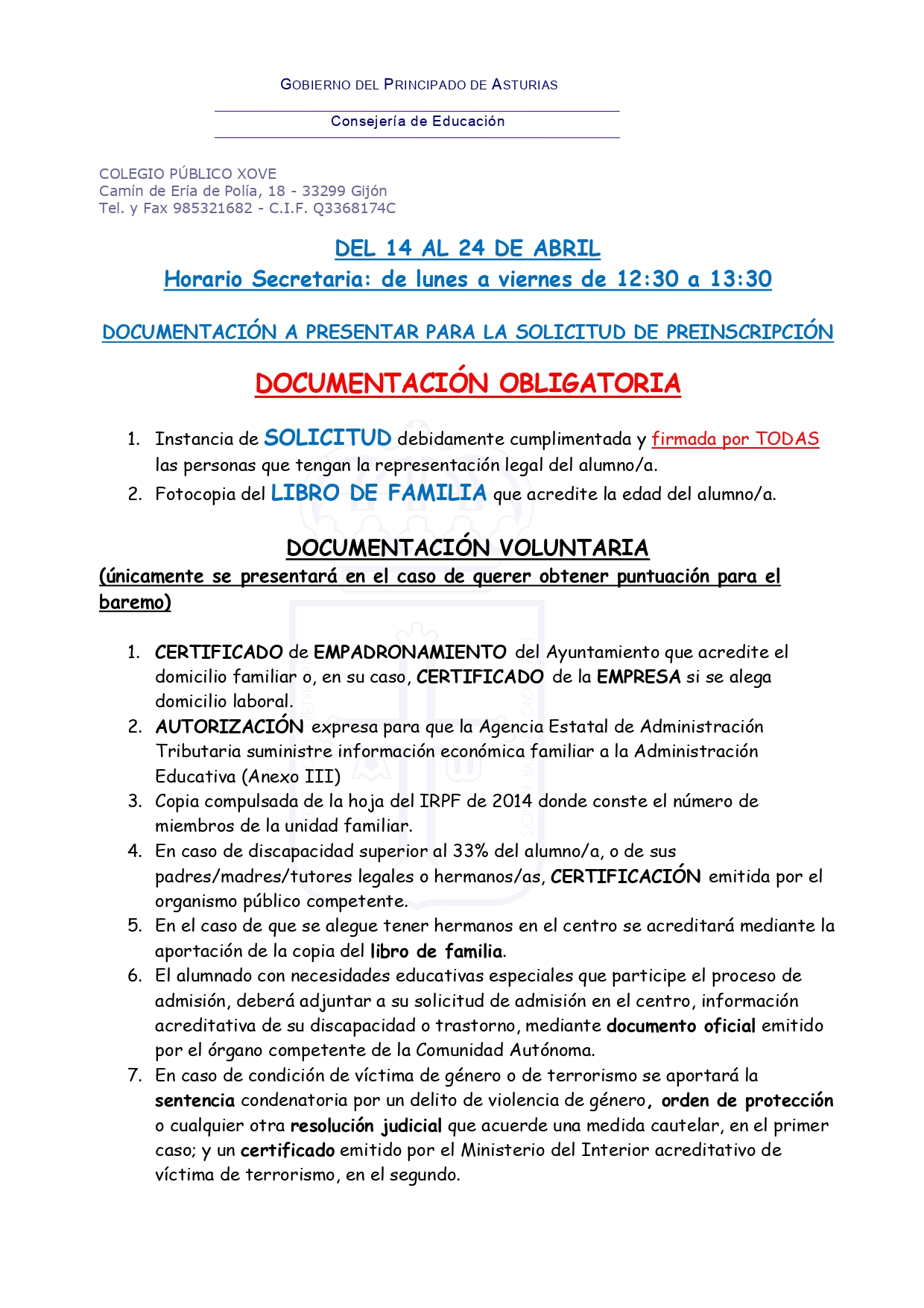 DOCUMENTACIÓN A PRESENTAR SOLICITUD PREINSCRIPCIÓN 2026-27