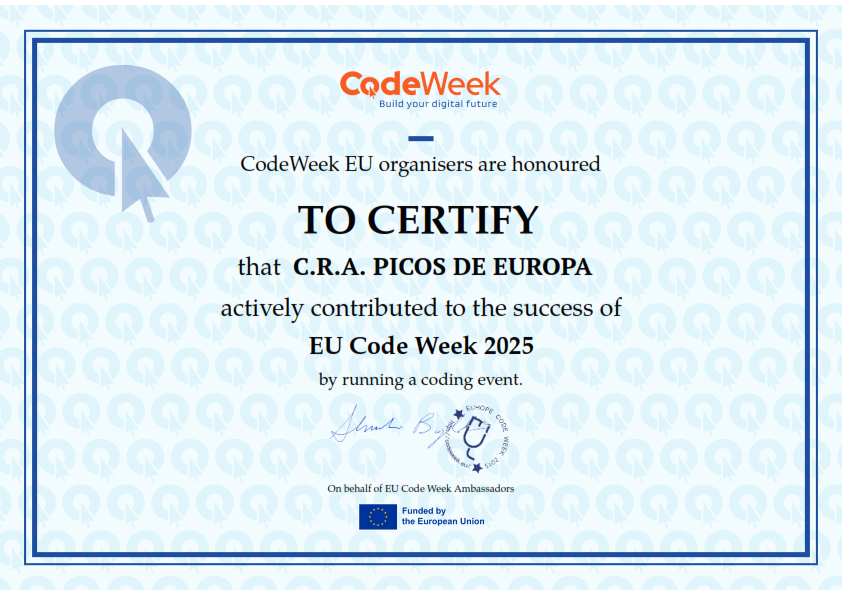 Nos complace anunciar que la Comisión Europea ha reconocido con la presente certificación la participación del centro, y más concretamente de su alumnado, en la semana del código europeo a través del desarrollo de actividades destinadas a la mejora del pensamiento computacional y el lenguaje de programación, así como la robótica, objetivo prioritario de todas las administraciones educativas en la formación del alumnado como ciudadanos y ciudadanas del siglo XXI. Enhorabuena a todos y todas los/as participantes y el equipo docente pues sin él estos objetivos serian imposibles de conseguir.