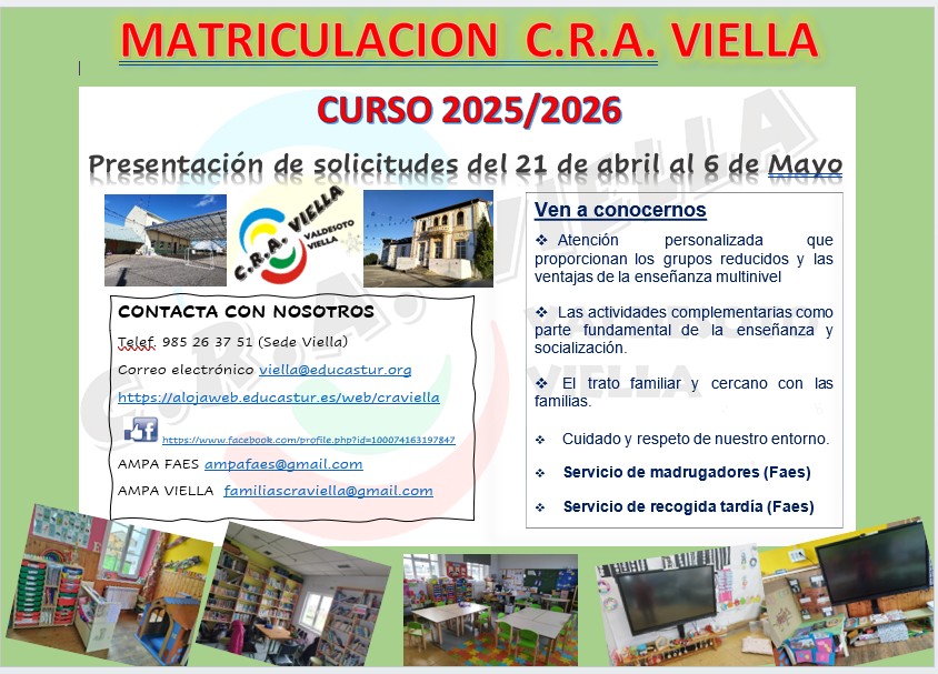 El C.R.A. de Viella os comunica que del 21 de abril al 6 de mayo estará abierto el plazo de presentación de solicitudes de Admisión en los centros educativos de Asturias para el alumnado de nuevo ingreso o cambio de centro.
