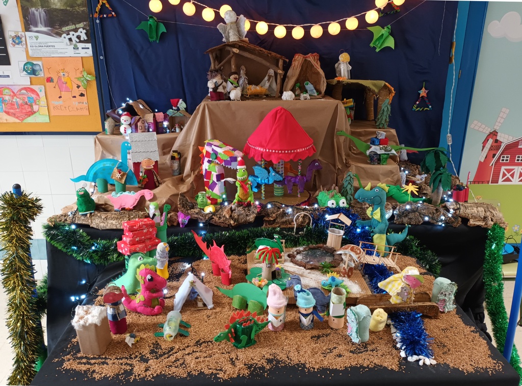 En el belén 2022, además de las figuras tradicionales, los protagonistas fueron los dinosaurios estando en relación con el proyecto de este trimestre.