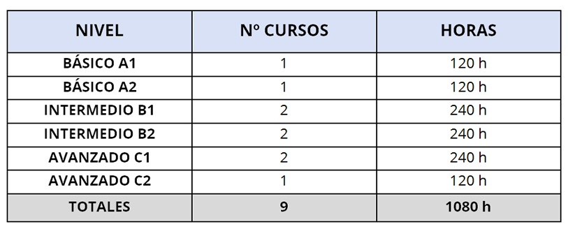 Las enseñanzas de idiomas se organizan en tres niveles: nivel básico, nivel intermedio y nivel avanzado. Estos niveles se corresponden, respectivamente, con los niveles A, B y C del Marco Común Europeo de Referencia para las Lenguas, que se subdividen en los niveles A1, A2, B1, B2, C1 y C2.