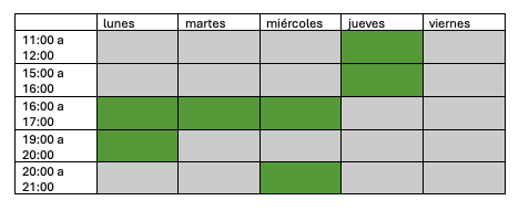 - El préstamo se realizará de manera presencial en las horas sombreadas en verde.