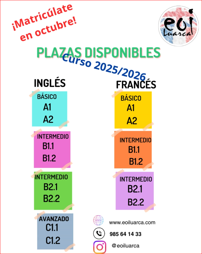 Se ofertan las plazas que han quedado libre en los distintos niveles después de terminarse el plazo de matrícula oficial.
