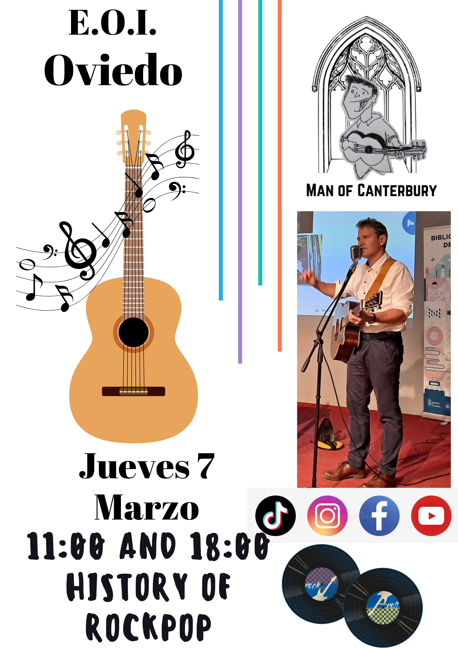 La EOI de Oviedo les invita a asistir al concierto didáctico titulado “History of Rock / Pop” que el profesor Kevin Alexander Salvage ofrecerá el jueves 7 de marzo en inglés en turno de mañana a las 11h y en turno de tarde a las 18h para hacer un repaso de la historia de estos estilos musicales. Se comentarán y se cantarán las canciones escogidas al respecto.
