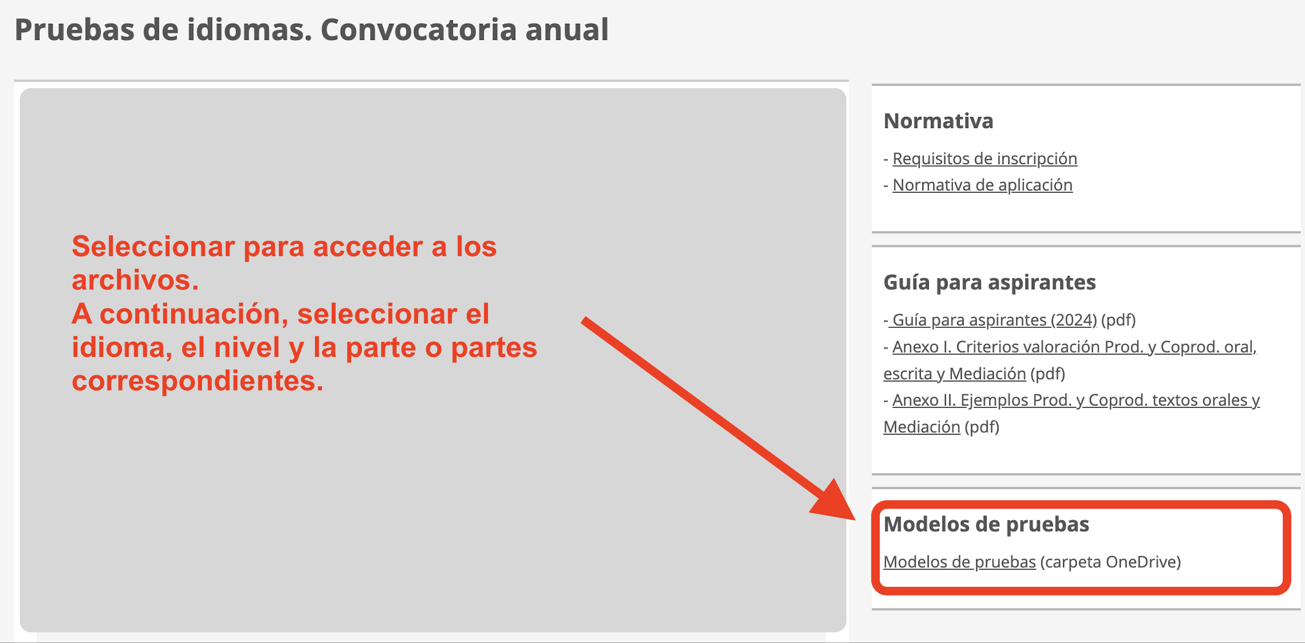 Los modelos de pruebas están alojadas en Educastur. Una vez ahí, seleccione "Modelos de pruebas" y para acceder a las mismas debe seleccionar la convocatoria, a continuación el idioma, el nivel y, finalmente, la parte o partes que quiere ver.