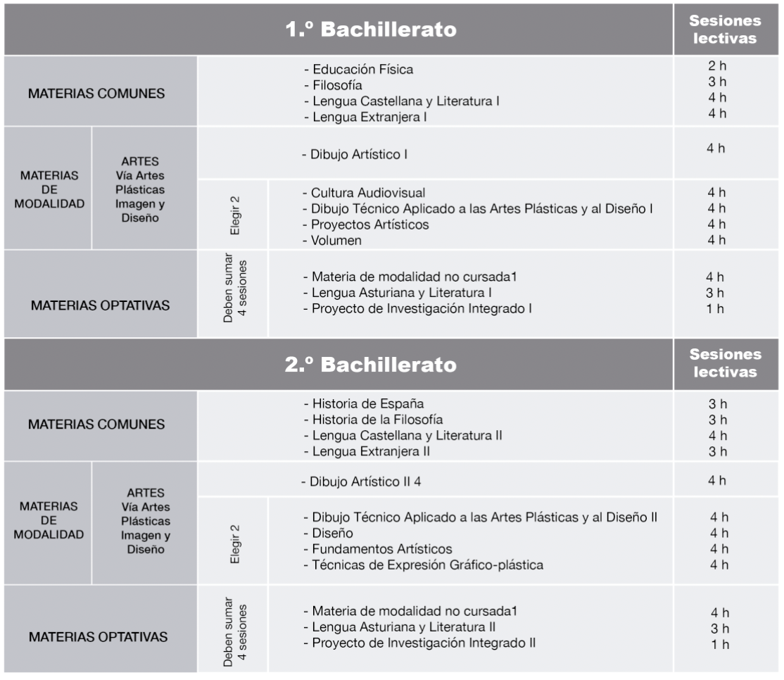 Esta modalidad del bachillerato que se imparte en la Escuela de Arte de Oviedo, tiene la ventaja de que las materias relacionadas con las artes gráficas y el diseño son impartidas por profesorado especialista en estas áreas y en los talleres (de volumen, de grabado, de dibujo, etc.) e instalaciones adecuados a cada una de ellas.