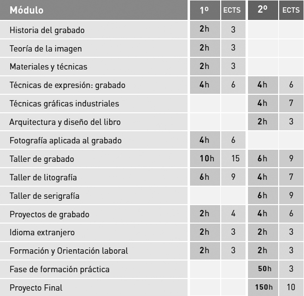 La preparación de este tipo de profesionales en la Escuela de Arte de Oviedo se desarrolla mediante un Ciclo Formativo de Grado Superior en el que, durante dos cursos académicos, se adquieren conocimientos sobre el grabado, la estampación y su historia, teoría de la imagen, materiales y técnicas asociados al grabado, idiomas.