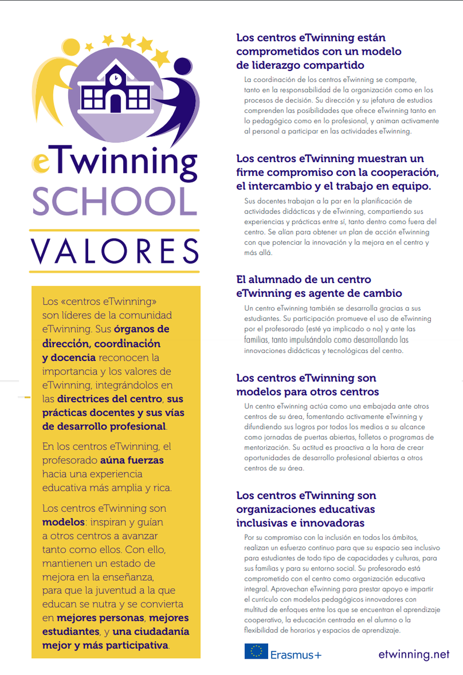 - Son reconocidas oficialmente a nivel europeo como modelos a seguir en eTwinning y forman una red de centros líderes para inspirar el desarrollo futuro de la acción.