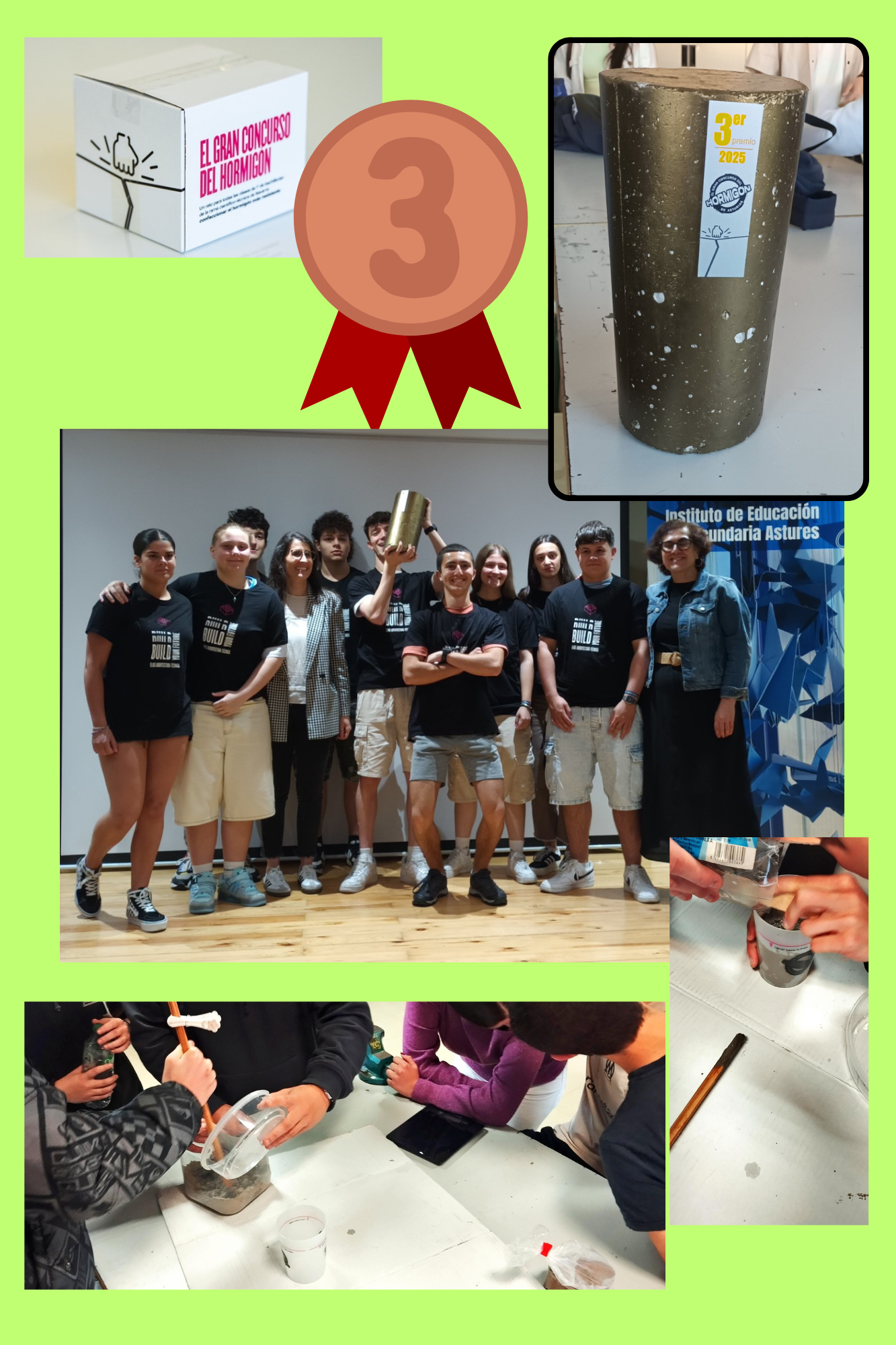 Por primer año en Asturias el Colegio de Aparejadores convoca el Gran Concurso del Hormigón dirigido a estudiantes de 1º Bachillerato y Cicos formativos de la rama de construcción. El equipo formado por 9 estudiantes de nuestro centro de la asignatura de Tecnología e Ingeniería 1 se han alzado con un mas que destacado tercer puesto de un total de 67 participantes en Asturias. . ¡¡¡Enhorabuena!!! ¡¡No podemos estar más orgullosos!!