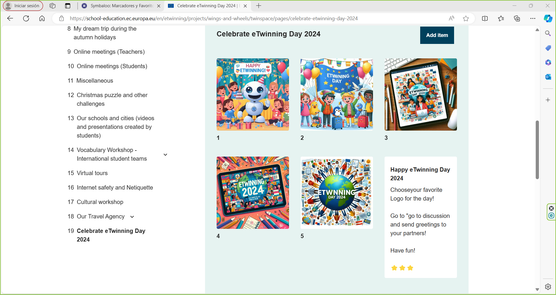 El jueves 9 de mayo es el Día de eTwinning y los eTwinners lo celebraremos en el muro del proyecto dejando mensajes y enviando saludos a nuestros compañeros de proyecto, subiendo fotos divertidas y votando un logo para que represente dicha fecha. ¡Feliz día de eTwinning!