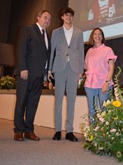 En la imagen, podemos ver a Cristian durante la ceremonia de graduación de 2º de bachillerato, acompañado por su tutora y por el Director del centro.