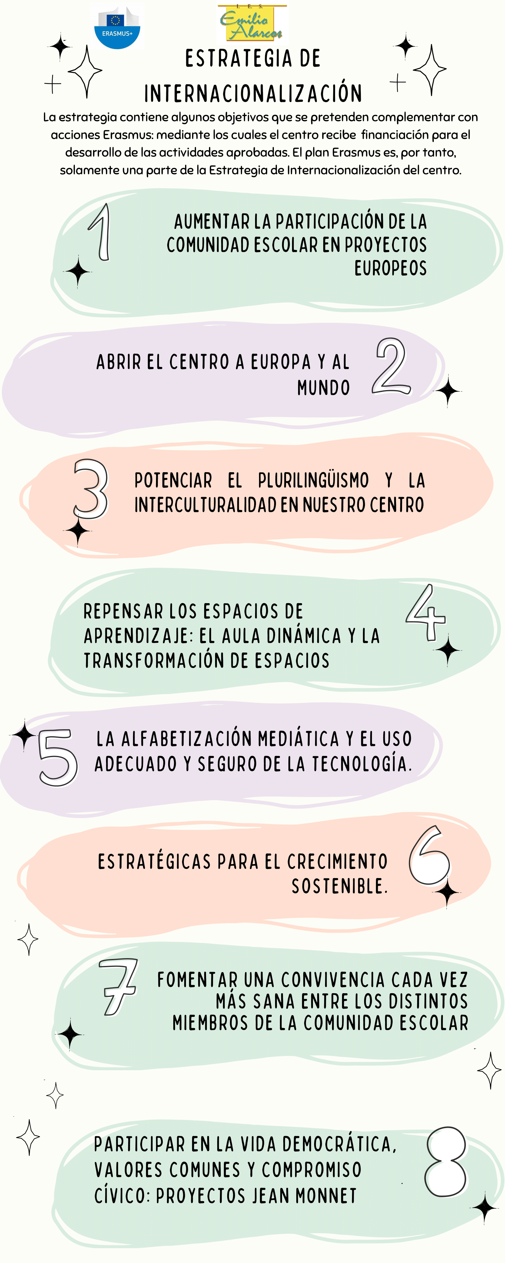 El Equipo de Internacionalización y Erasmus del IES Emilio Alarcos tiene como misión promover la participación del centro en proyectos educativos europeos, brindando a la comunidad educativa oportunidades para integrar una dimensión internacional e intercultural en su enseñanza. Además, es responsable de gestionar y desarrollar las acciones vinculadas al programa Erasmus+, impulsando la movilidad, el intercambio cultural y el enriquecimiento académico de estudiantes y docentes a través de iniciativas que fomentan la colaboración y el aprendizaje a nivel europeo.